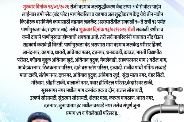 नागरिकों से संयमित उपयोग की अपील पुणे, 11 फरवरी 2026 : पुणे महानगरपालिका के वडगांव जलशुद्धीकरण केंद्र (टप्पा-1) में तकनीकी…