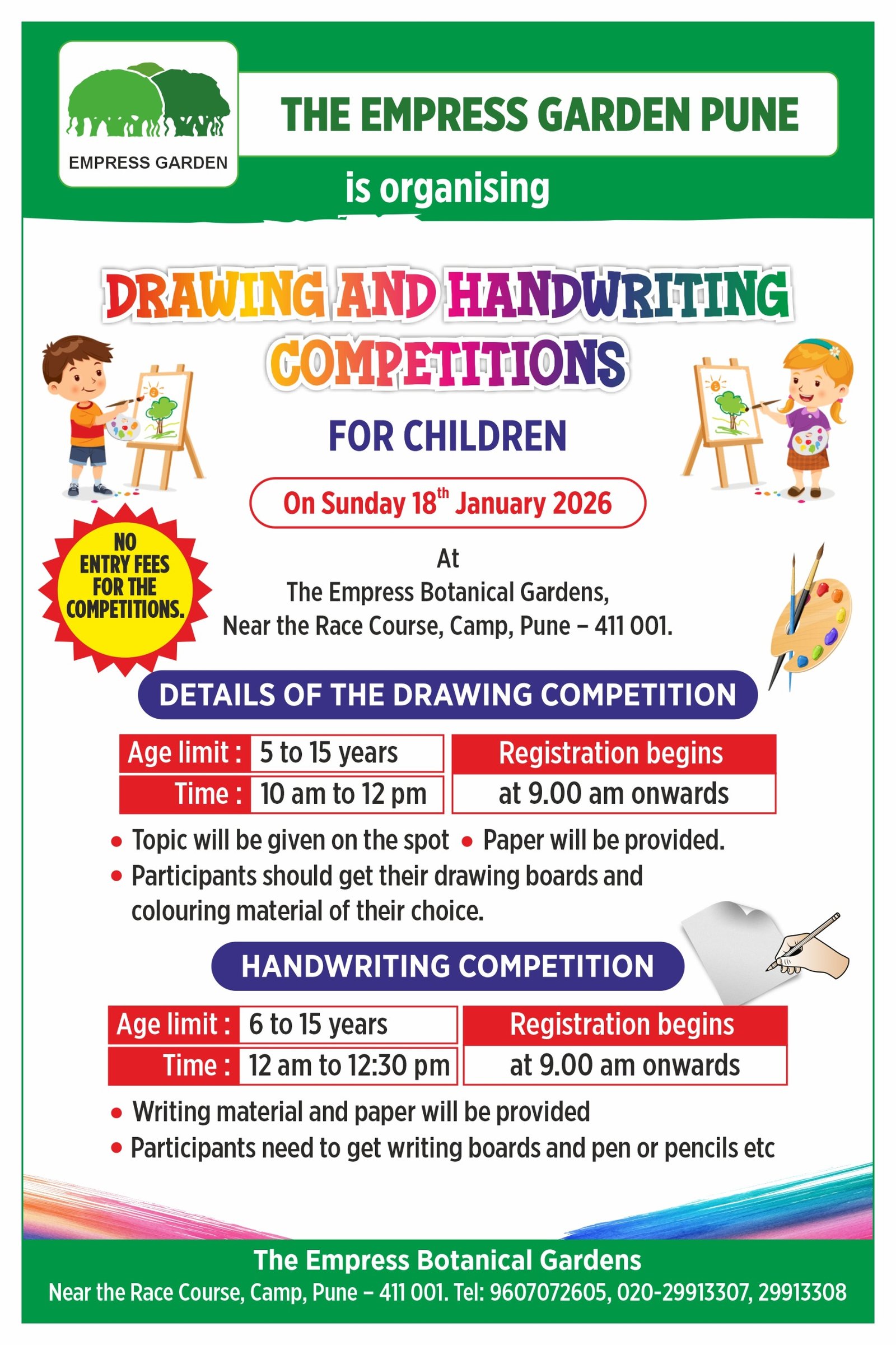 Pune, : The Empress Botanical Garden, Pune, is organising Drawing and Handwriting Competitions for children on Sunday, 18 January 2026, at the Empress Botanical Garden near Race Course, Pune – 411001. The organisers have announced that there will be no entry fee for either of the competitions.