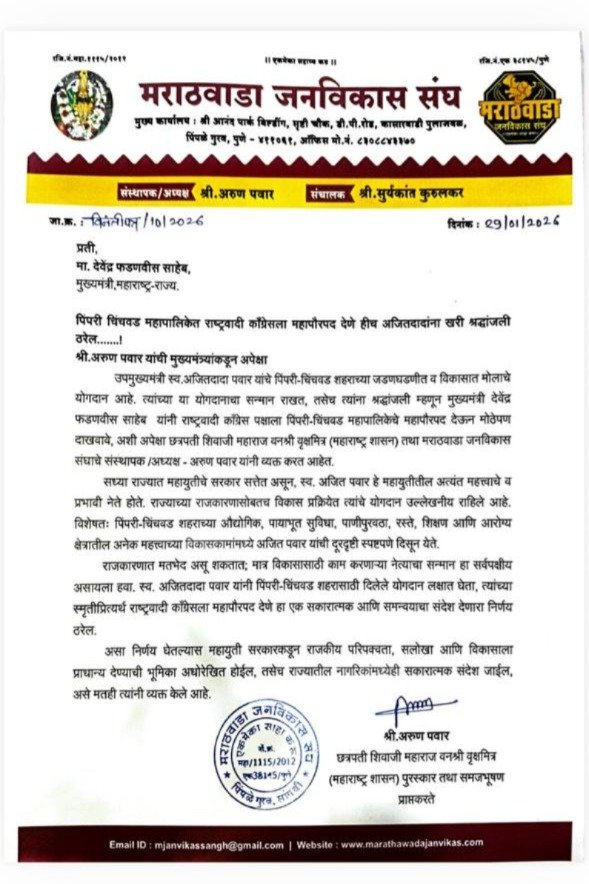 अरुण पवार पुढे म्हणाले की, राजकारणात मतभेद असू शकतात; मात्र विकासासाठी काम करणाऱ्या नेत्याचा सन्मान हा सर्वपक्षीय असायला हवा. स्व. अजित पवार यांनी पिंपरी-चिंचवड शहरासाठी दिलेले योगदान लक्षात घेता, त्यांच्या स्मृतीप्रित्यर्थ राष्ट्रवादी काँग्रेसला महापौरपद देणे हा एक सकारात्मक आणि समन्वयाचा संदेश देणारा निर्णय ठरेल.