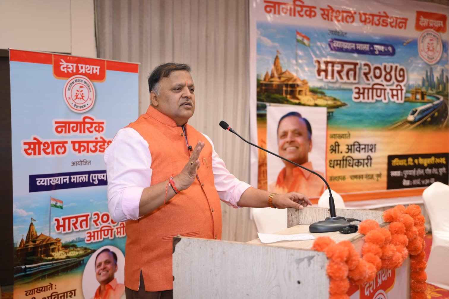 नागरिक सोशल फाउंडेशन तर्फे आयोजित करण्यात आलेल्या ‘भारत 2047 आणि मी’ या विषयावरील व्याख्यानमालेत अविनाश धर्माधिकारी बोलत होते. संस्थेचे वक्ता विभाग प्रमुख दीपक मेहेंदळे, विश्वस्त अमेय सप्रे, प्रीतम थोरवेआदि यावेळी उपस्थित होते.