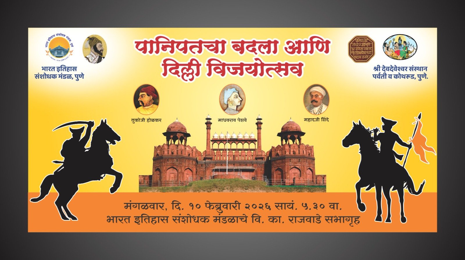 पुणे : भारत इतिहास संशोधक मंडळ व श्री देवदेवेश्वर संस्थान यांच्या संयुक्त विद्यमाने “दिल्ली विजय आणि पानिपत बदला विजयसोहळा” या ऐतिहासिक कार्यक्रमाचे आयोजन मंगळवार, दिनांक १० फेब्रुवारी २०२६ रोजी सायंकाळी ५.३० वाजता करण्यात आले आहे.