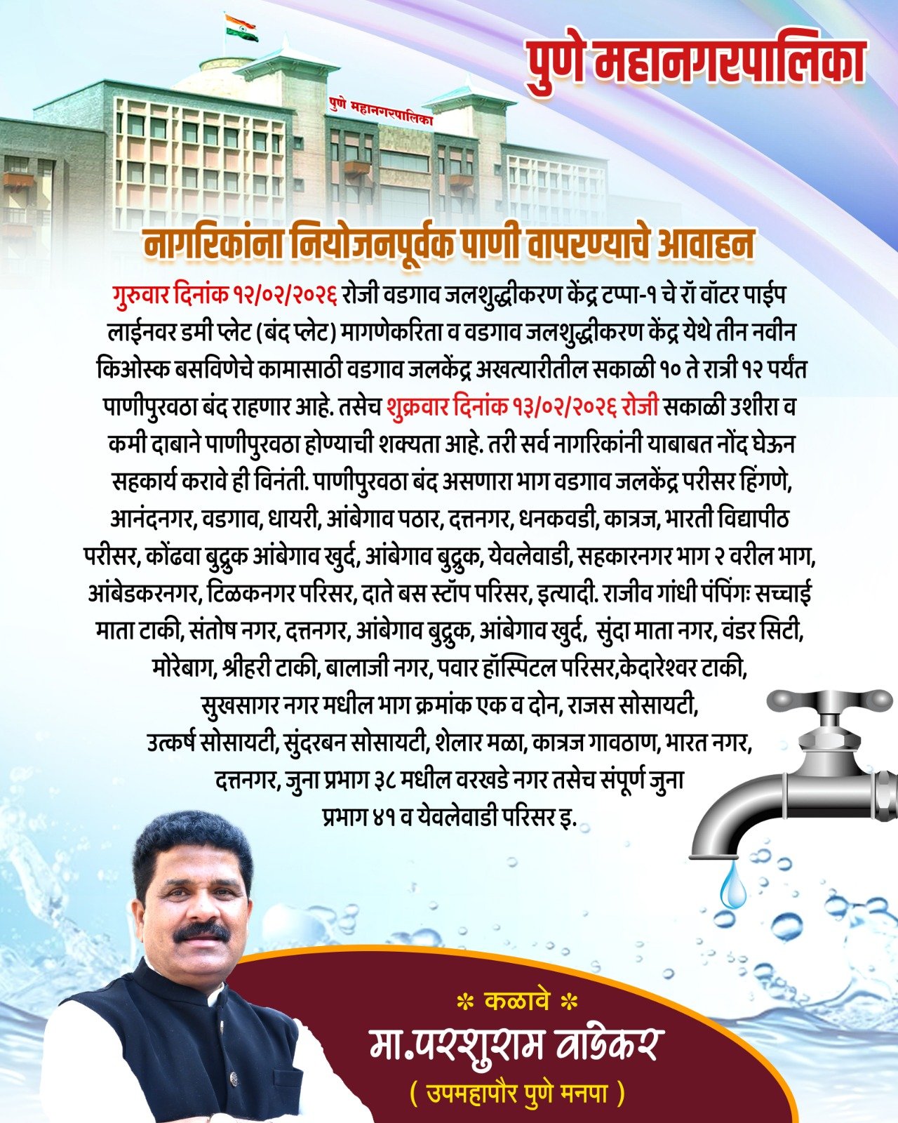 पुणे, 11 फरवरी 2026 : पुणे महानगरपालिका के वडगांव जलशुद्धीकरण केंद्र (टप्पा-1) में तकनीकी कार्य के चलते गुरुवार, 12 फरवरी 2026 को संबंधित क्षेत्रों में पानी की आपूर्ति बंद रहेगी। उपमहापौर मा. परशुराम वाडेकर ने नागरिकों से नियोजनपूर्वक पानी का उपयोग करने तथा प्रशासन को सहयोग देने की अपील की है। उपमहापौर मा. परशुराम वाडेकर ने कहा कि यह कार्य शहर के जल प्रबंधन को अधिक सुदृढ़ और व्यवस्थित बनाने के लिए किया जा रहा है। उन्होंने नागरिकों से अपील की कि वे इस दौरान धैर्य रखें और जल बचत का पालन करें।