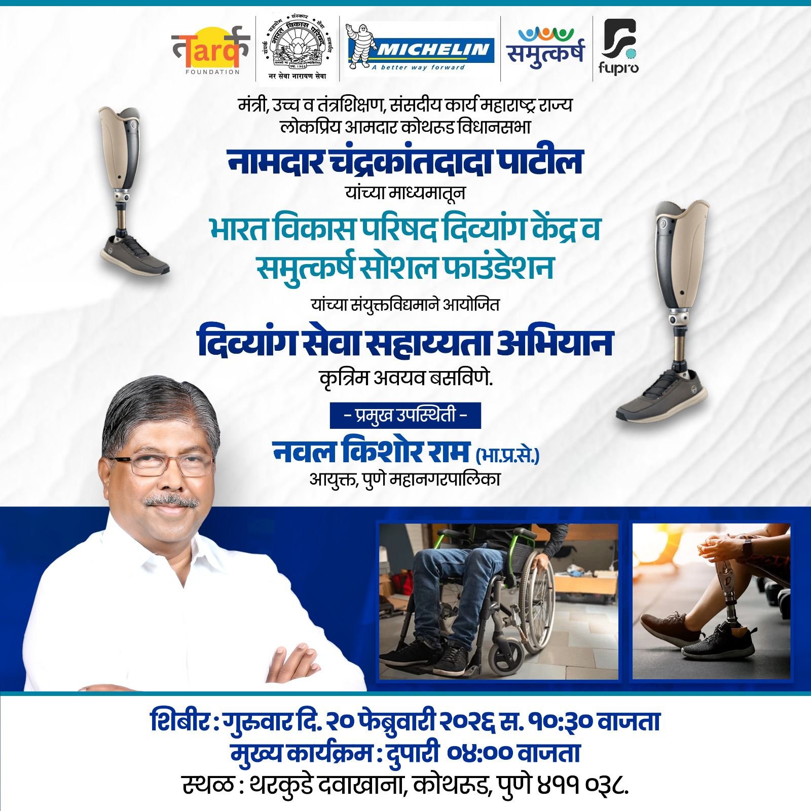 यह कार्यक्रम तर्क फाउंडेशन, भारत विकास परिषद, फ्युप्रो, मिशेलिन और समुत्कर्ष सोशल फाउंडेशन के संयुक्त सहयोग से 20 फरवरी को आयोजित किया जा रहा है, इस समारोह में पुणे के चयनित दिव्यांग लाभार्थियों को नि:शुल्क कृत्रिम अंग प्रदान किए जाएंगे।दोपहर 4:30 बजे कोथरुड स्थित थरकुडे दवाखाना में आयोजित किया जाएगा। कार्यक्रम में केंद्रीय राज्य मंत्री मुरलीधर मोहोळ, राज्य के उच्च व तकनीकी शिक्षा मंत्री चंद्रकांतदादा पाटील, सांसद मेधाताई कुलकर्णी तथा पुणे महानगरपालिका आयुक्त नवल किशोर राम प्रमुख रूप से उपस्थित रहेंगे।